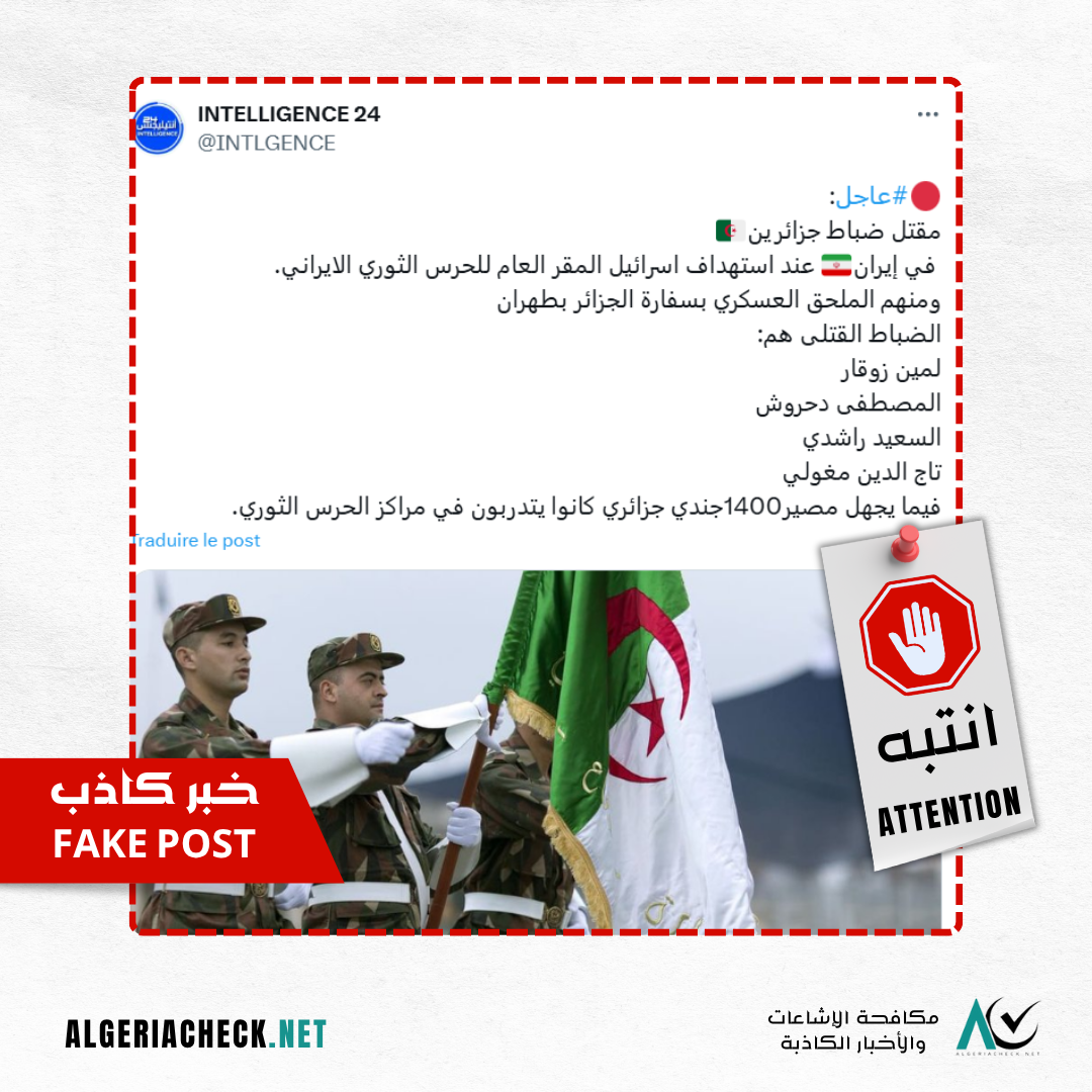 نشرت إحدى الصفحات على فيسبوك خبرًا يزعم “مقتل ضباط جزائريين في إيران بعد استهداف لمقر للحرس الثوري الإيراني”، وتم تداول لقطة شاشة للمنشور ومشاركته على نطاق واسع.